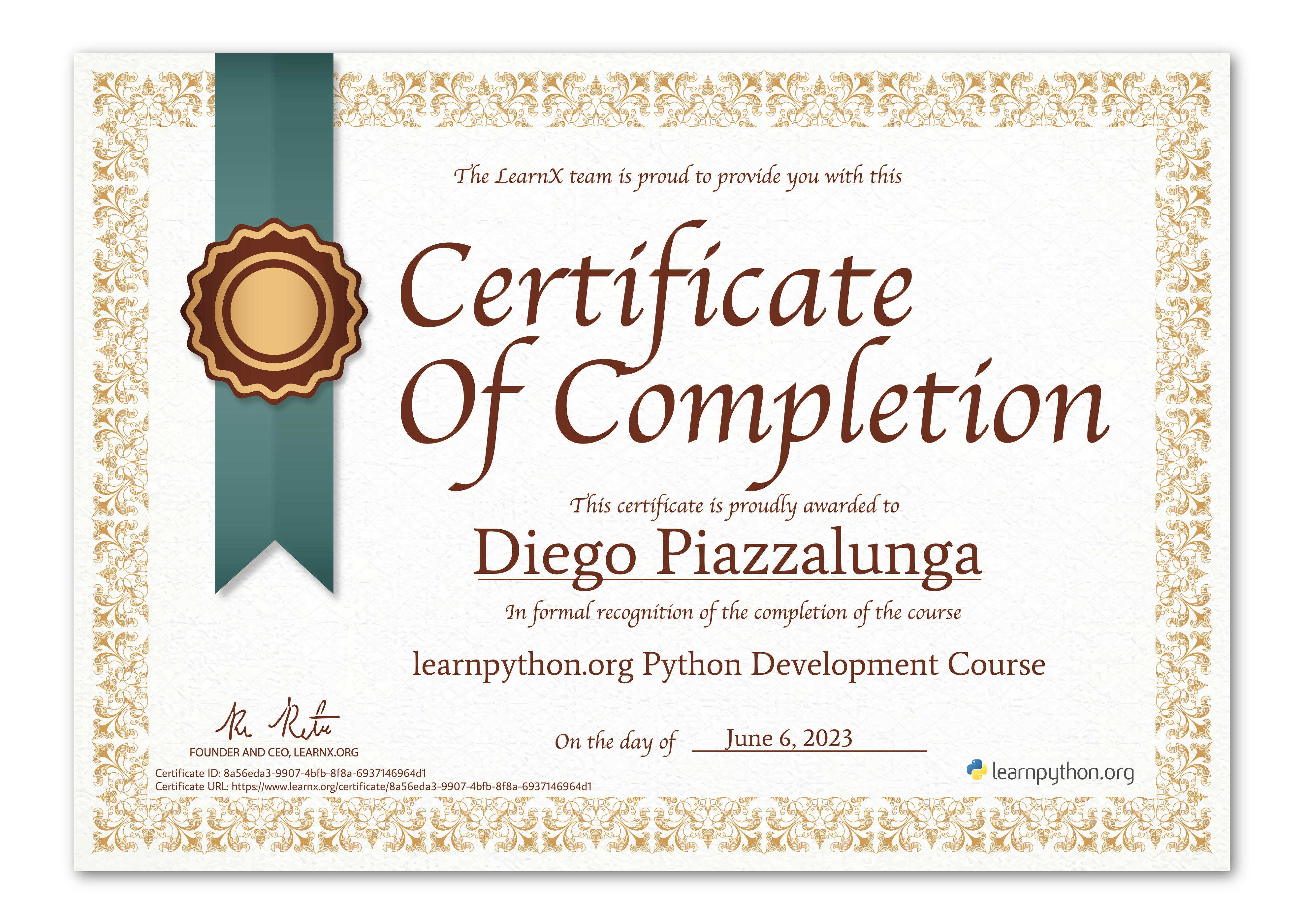This certificate is issued to Diego Piazzalunga for completing the Python Development Course.